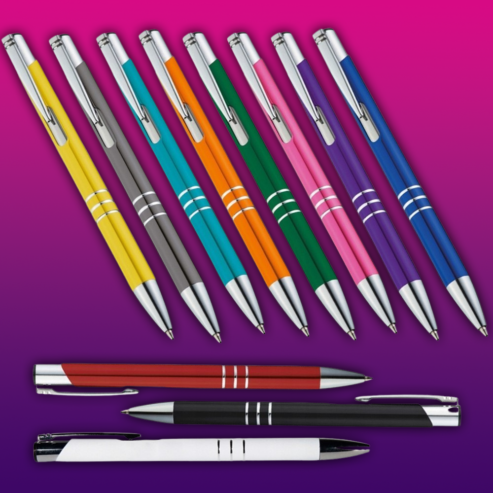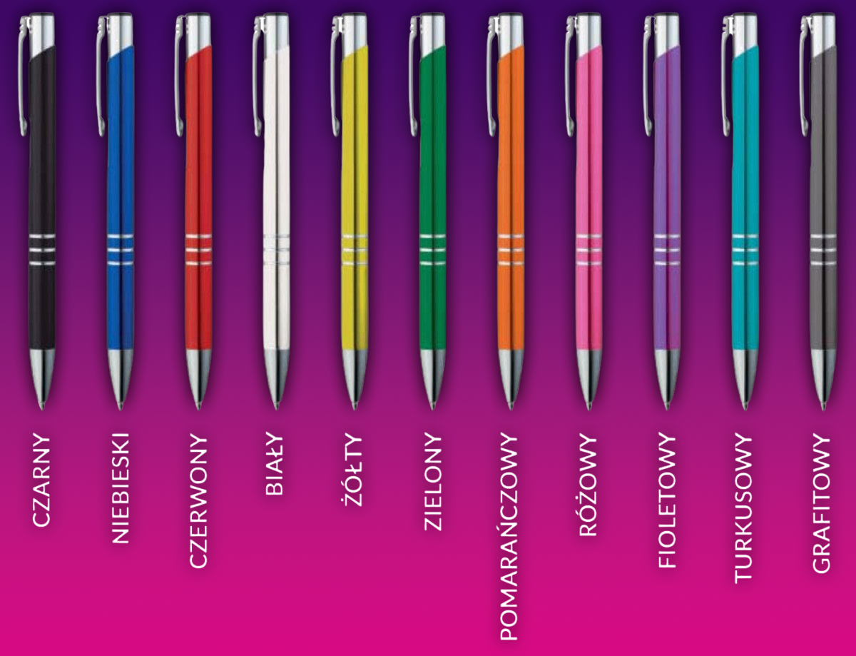 Kolor Długopisów | Biały, Czarny, Czerwony, Fioletowy, Grafitowy, Niebieski, Pomarańczowy, Różowy, Turkusowy, Zielony, Żółty |