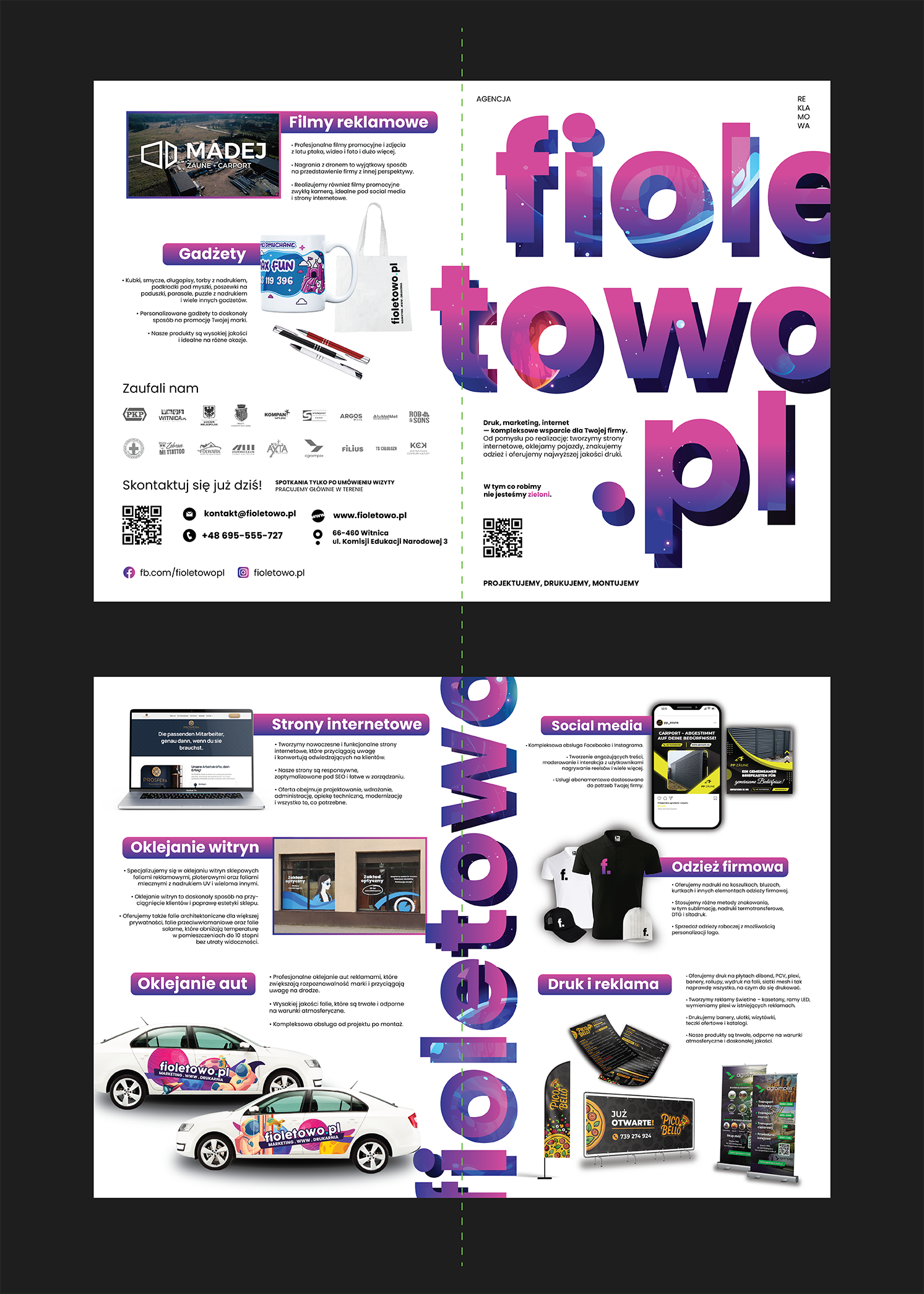 W Fioletowo.pl zajmujemy się projektowaniem graficznym materiałów reklamowych i firmowych. Tworzymy projekty, które nie tylko dobrze wyglądają, ale przede wszystkim skutecznie przyciągają uwagę i wspierają sprzedaż.